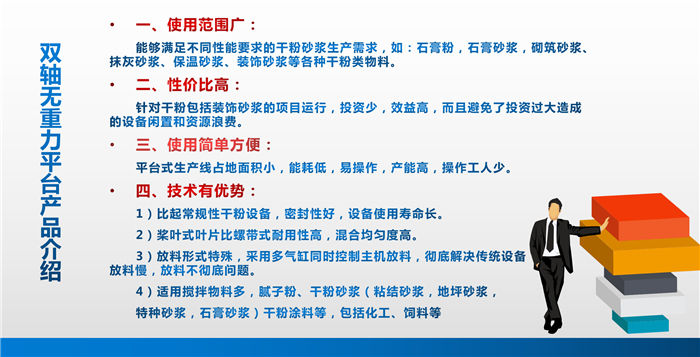 按照生產流程自上而下布置;能耗相對低;占地面積小;原料交叉污染小;外觀大氣,適用于普通砂漿和部分特種砂漿生產。干混砂漿攪拌站控制系統,FB系列砂漿攪拌站雙機同步控制,主要硬件由兩臺計算機、高性能的微電腦控制器、人機界面、高速高精度的稱重單元和國際著名低壓電器元件組成。